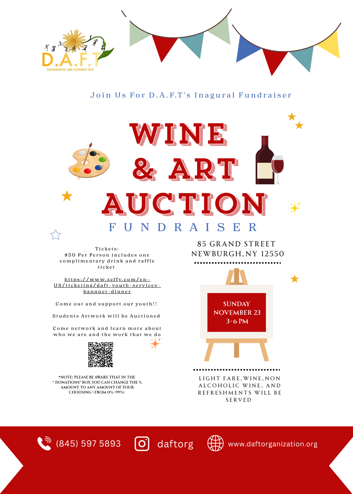 Join us for our very first Wine & Art Auction! This exciting event will showcase original artwork created by our students, paired with an evening of wine (and non-alcoholic options), light fare, and community connection. Our goal is to raise $20,000 to support programs that provide leadership development, social-emotional learning, and academic enrichment for Newburgh youth. Come out, bid on student art, and learn more about how we serve our community! Click here to purchase your ticket.