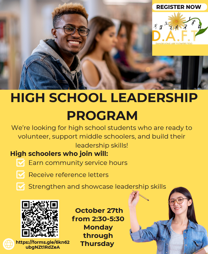 D.A.F.T Youth Services is excited to launch our High School Leadership Program! We are looking for motivated high school students who want to build their leadership skills while making a difference in the lives of middle schoolers in our after-school program. As a youth leader, you will have the opportunity to share your own skills and talents, serve as a positive role model, and help create a safe, and supportive space for younger students to grow. Some of the activities high schoolers will engage in include the following: